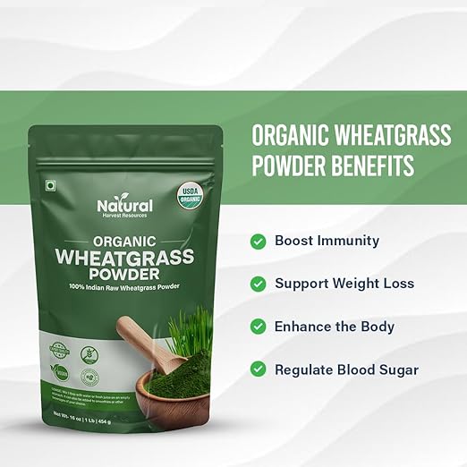 Clean, Safe & Certified Organic – USDA Certified, Non-GMO, Vegan & Gluten-Free wheatgrass powder. No artificial colour, sugar, or preservatives – only 100% natural nutrition you can trust every scoop of.